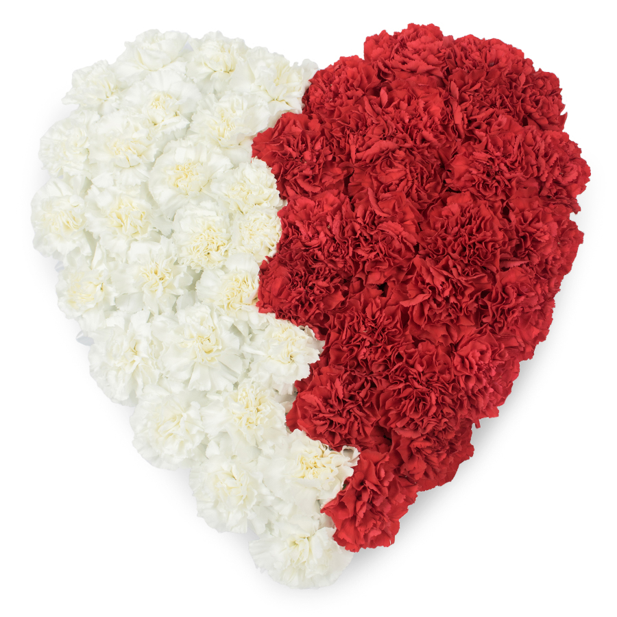 Illuminate any space with our radiant heart-shaped arrangement of white and red carnations. Each flower is hand-selected to ensure unparalleled freshness and vibrant colors.