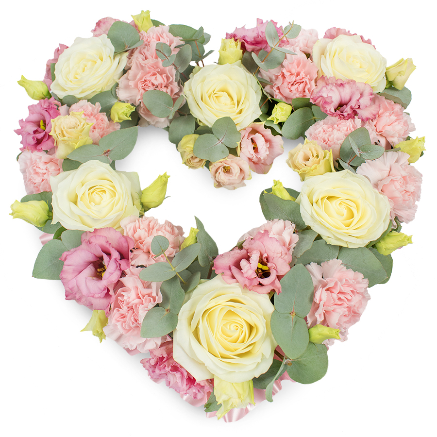 Express your love and remembrance with our exquisite open heart floral tribute. This elegant arrangement features a stunning mix of white roses, pink carnations, and pink lisianthus, enriched with fresh eucalyptus leaves. Each flower is hand-selected for maximum freshness, ensuring a vibrant and lasting display.