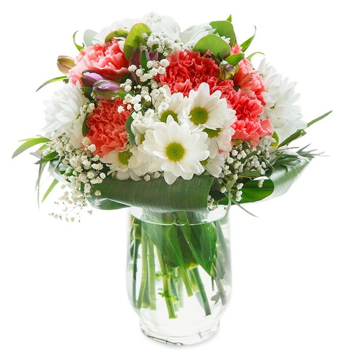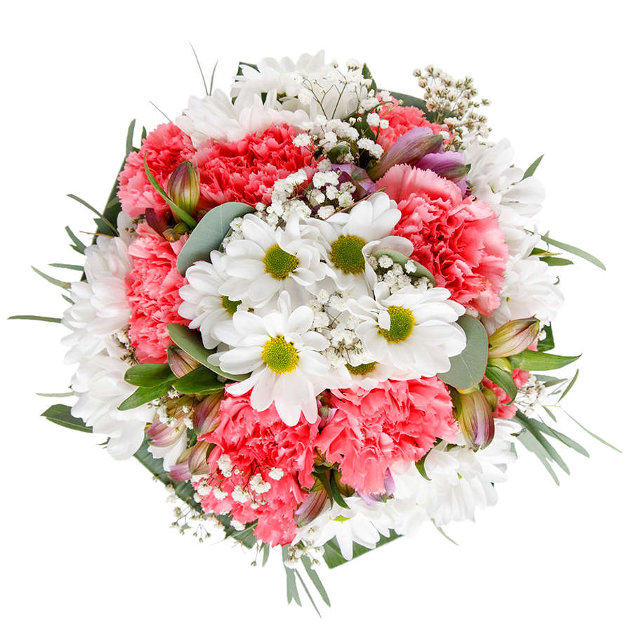Celebrate beauty and sophistication with our graceful floral ensemble, meticulously arranged to enchant and delight. This stunning bouquet features a blend of pristine white chrysanthemums, delicate gypsophila, and charming light pink carnations, accented with vibrant aspidistra leaves.